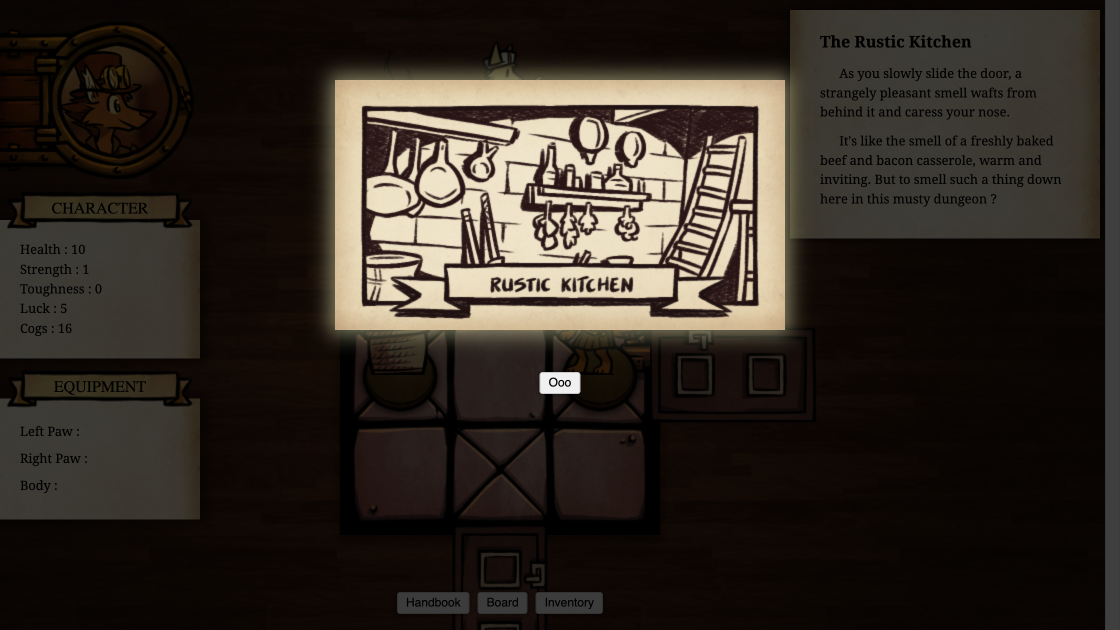 A lost traveller looks for an exit from an underground dungeon they somehow found themself in for some inexplicable reason. A medium sized game that's a mix between an action adventure board game and old school choose-your-own adventure books.